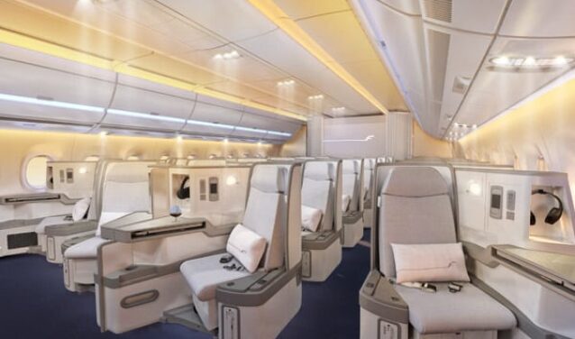 Airbus A350-1000 вмещает от 350 до 410 пассажиров в трехклассной конфигурации. A350-1000 предлагает пассажирам самый тихий двухнефный салон в небе, широкие сиденья и светодиодное освещение для минимизации последствий смены часовых поясов.